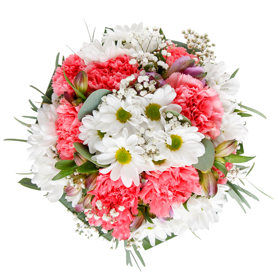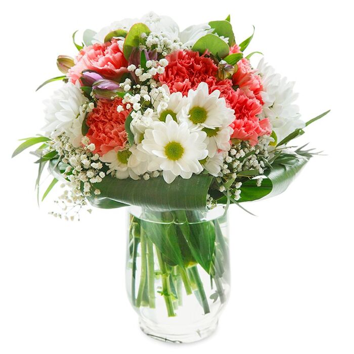 Brighten someone's day with our stunning and unique flower arrangement. This elegant bouquet showcases snow-white chrysanthemums, delicate gypsophila, and soft light pink carnations, beautifully arranged with rich aspidistra leaves.